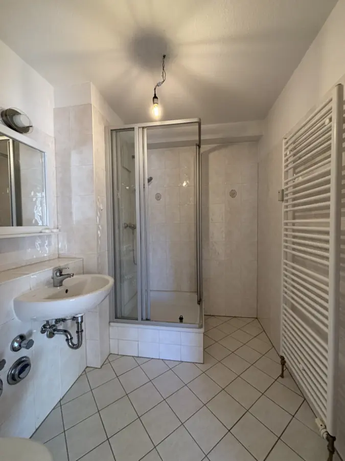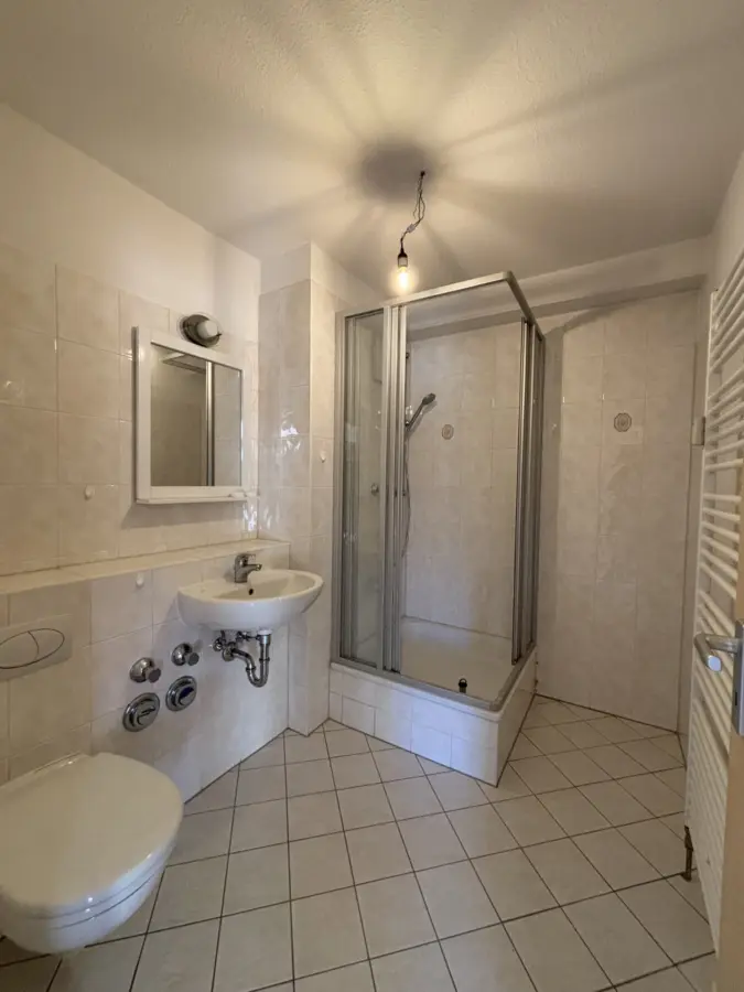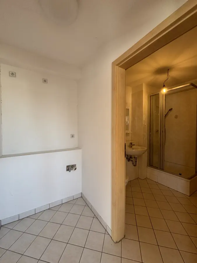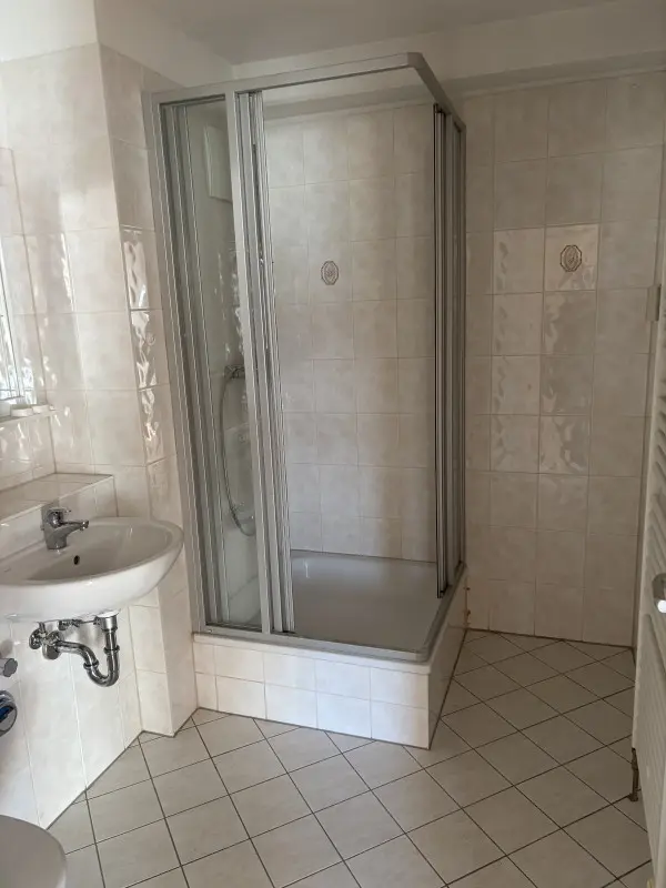 Bad Fußboden gefliest, Bad Nassbereich gefliest, Dusche, Elektroherdanschluss, Fernheizung, Küche mit Fliesenspiegel