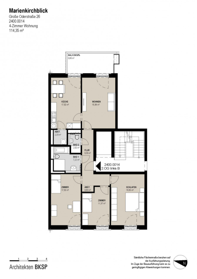 Die großzügige Wohnung verfügt auf ca. 114 m² Wohnfläche über 4 großzügige Zimmer, zwei Bäder (Badewanne und Dusche), einen separaten Abstellraum und einen Balkon mit wettergeschütztem Abstellabteil. Die Böden in den Wohnräumen sind mit Echtholzparkett ausgestattet (fest verlegt), die Böden in den Nassbereichen (Bäder und Abstellraum) sind gefliest. Der Balkon ist von der Küche und dem Wohnzimmer begehbar. Die Bäder bieten weiterhin auch einen zusätzlichen Handtuchheizkörper und Ablageflächen über dem Waschtisch bzw. WC. Im separaten Abstellraum finden Sie den Anschluss für die Waschmaschine. Die Wohnung wird komplett über eine Fußbodenheizung mit Wärme versorgt (Fernwärme, alle Räume individuell steuerbar). Bodentiefe Holz-Fenster in 3-fach-Isolierverglasung versorgen die Wohnung mit Tageslicht und sorgen für exzellenten Schallschutz und sehr gute Energiewerte. Diese lassen sich bei Bedarf elektrisch einzeln oder per Generalsteuerung im Flur mit einem Sicht- bzw. Sonnenschutz abschatten. Die Video-Türöffnungsanlage sorgt für Sicherheit und gewährt Ihrem Besuch Zutritt. Ein zur Wohnung gehöriger Kellerraum sowie ein Gemeinschaftskeller für Fahrräder, Kinderwagen etc. komplettieren das Angebot und sind auch per Aufzug im Untergeschoss erreichbar.